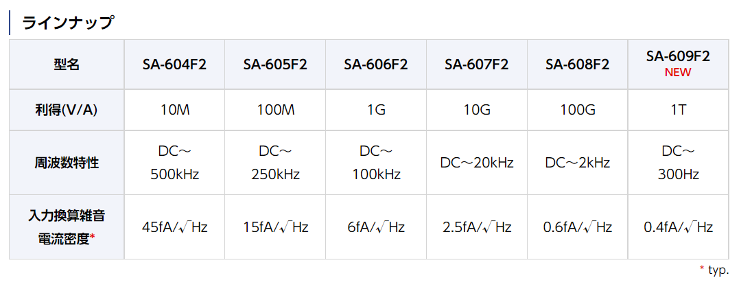 10M/100M/1G/10G/100G/1T(V/A)の各利得をラインナップしました。